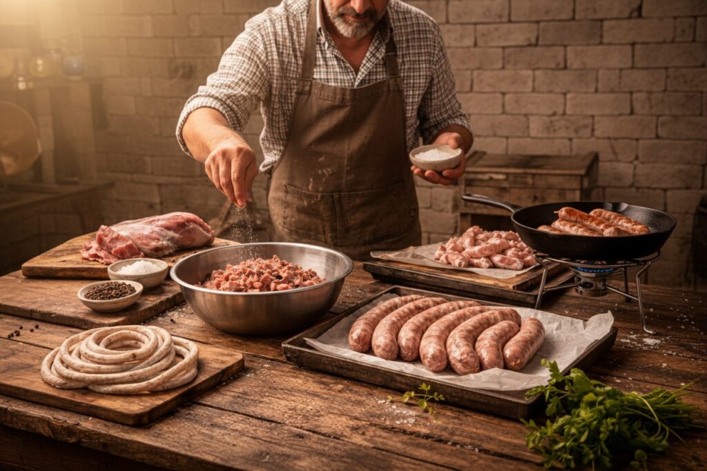 La carne se pica gruesa. Se sala. Se mezcla despacio. Se embute sin apretar demasiado. Después reposo en frío. Mínimo unas horas. Mejor un día. La diferencia se nota.